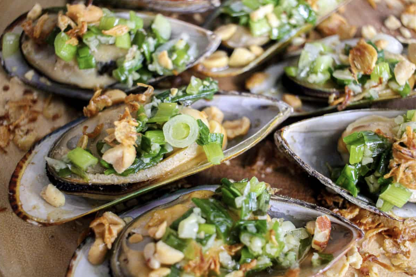 Fresh oysters from Bai Tu Long Bay are grilled over charcoal until the edges curl, topped with fragrant scallion oil, crushed peanuts, and a dash of chili sauce.