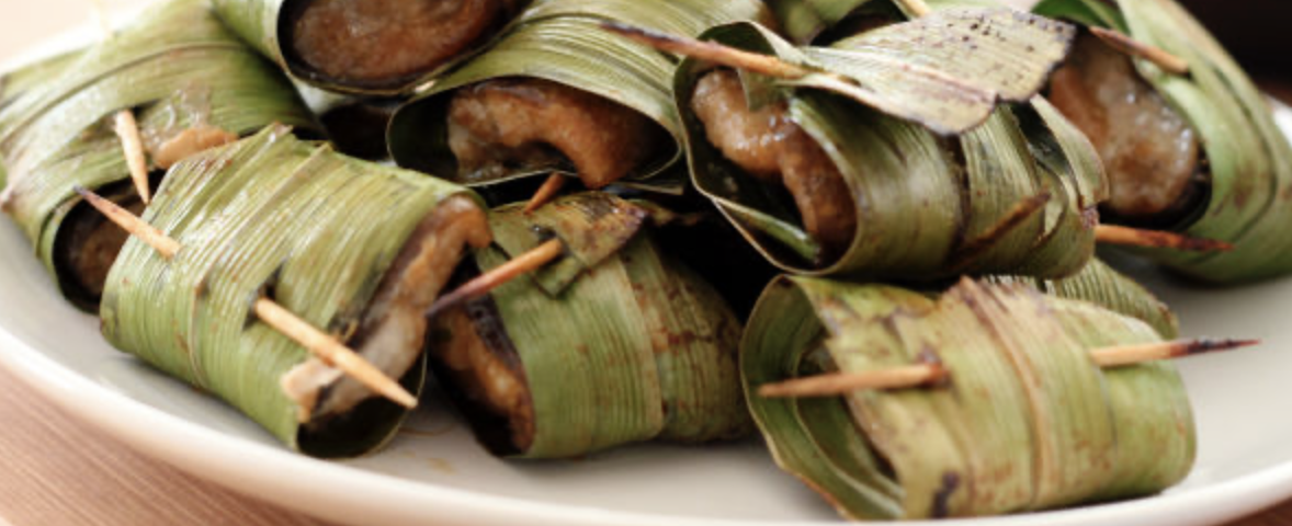 Marinated basa fillets are wrapped in pandan leaves, grilled to a golden brown, and served with rice and vegetables.