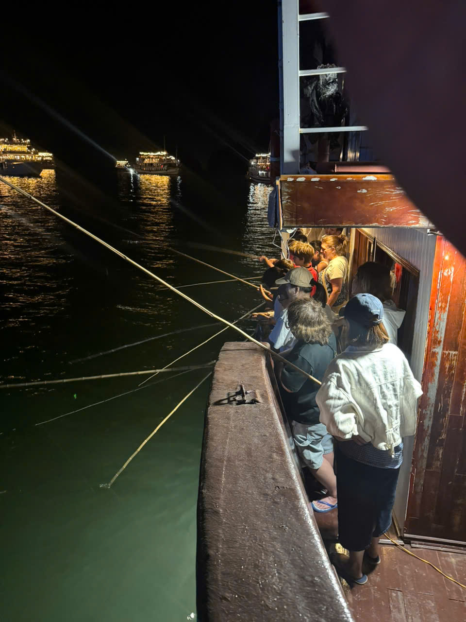 After a cozy dinner, as the night falls over the bay, some guests return to their cabins while others gather on deck to experience squid fishing – a traditional pastime of Vietnamese fishermen, looking to connect with local life. The crew will guide you how to catch squid, with a very simple technique, suitable even for beginners. The crew can share stories of their childhood fishing in these waters. Someone will surely scream in amazement when they catch their first squid. Laughter echoes across the quiet bay. You may catch five squids or none, but either way, you will remember the night forever.