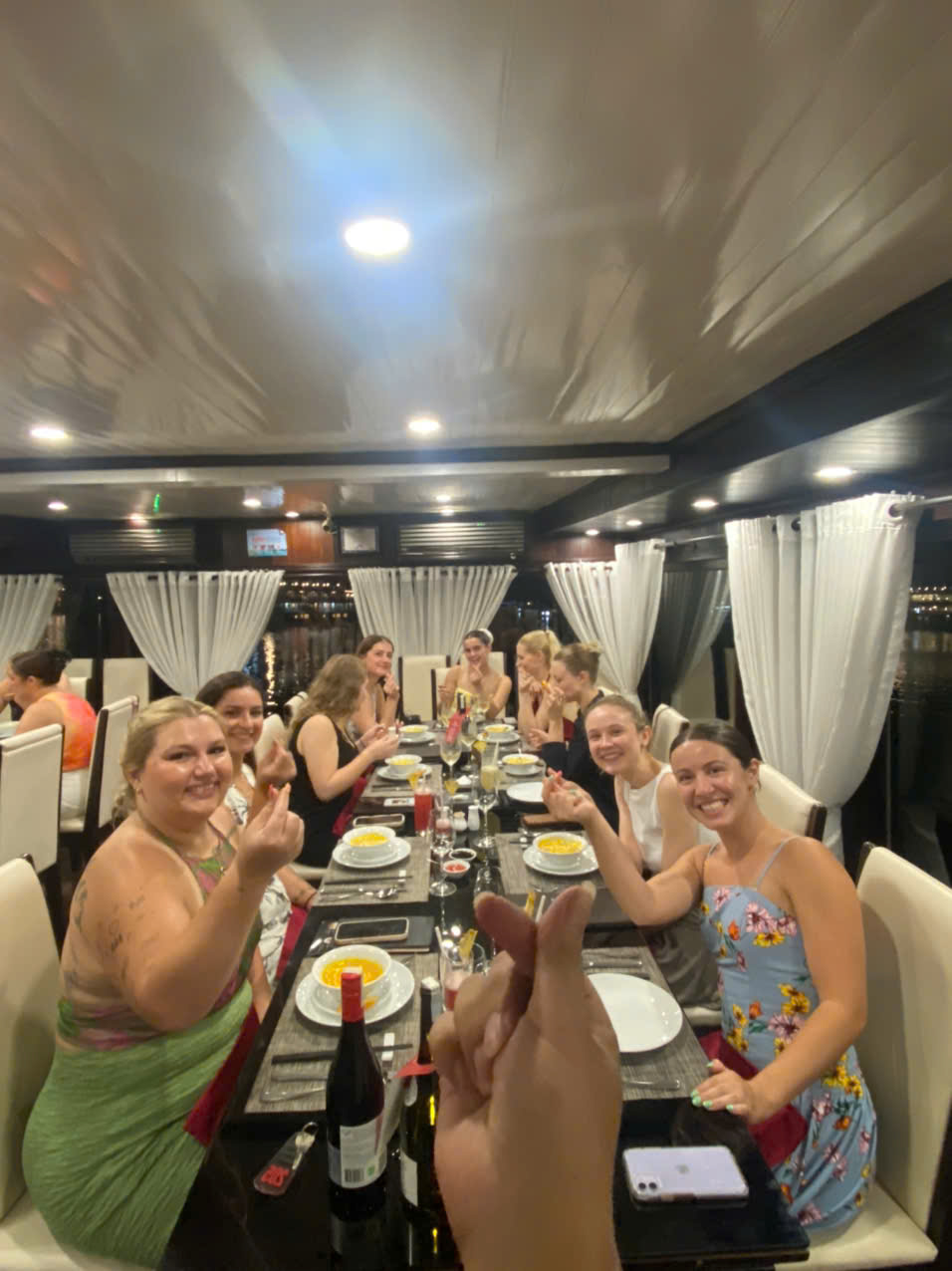 The evening began with dinner as the sunset cast a golden and amber glow over the bay. Softly flickering candles and soft music created a cozy and relaxing atmosphere. The menu was served à la carte, accompanied by a glass of Chardonnay. Each dish showcased fresh local ingredients and traditional Vietnamese flavors. “My favorite was the fragrant basa fish wrapped in leaves. The ‘dancing shrimp’ on hot stones was also interesting and perfectly cooked. These were all simple dishes, but all reached restaurant quality”, she said.